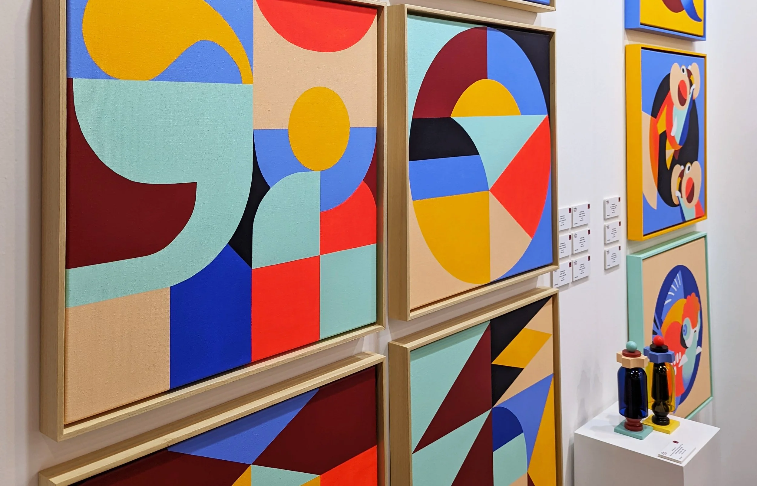 For Affordable Art Fair Hong Kong, Cynthia is not only showing her new paintings of geometric characters; she has also challenged herself to create the characters as 3D sculptures. Two other HK artists are collaborating on the project: Screw Up Studio, which specialises in woodwork, and KC Wong in glasswork. The 3D characters are made and assembled from geometric shapes cut out of wood and glass and set off by the artist’s signature bold colours. So, for the first time, viewers will be able to admire Cynthia’s characters from all angles!