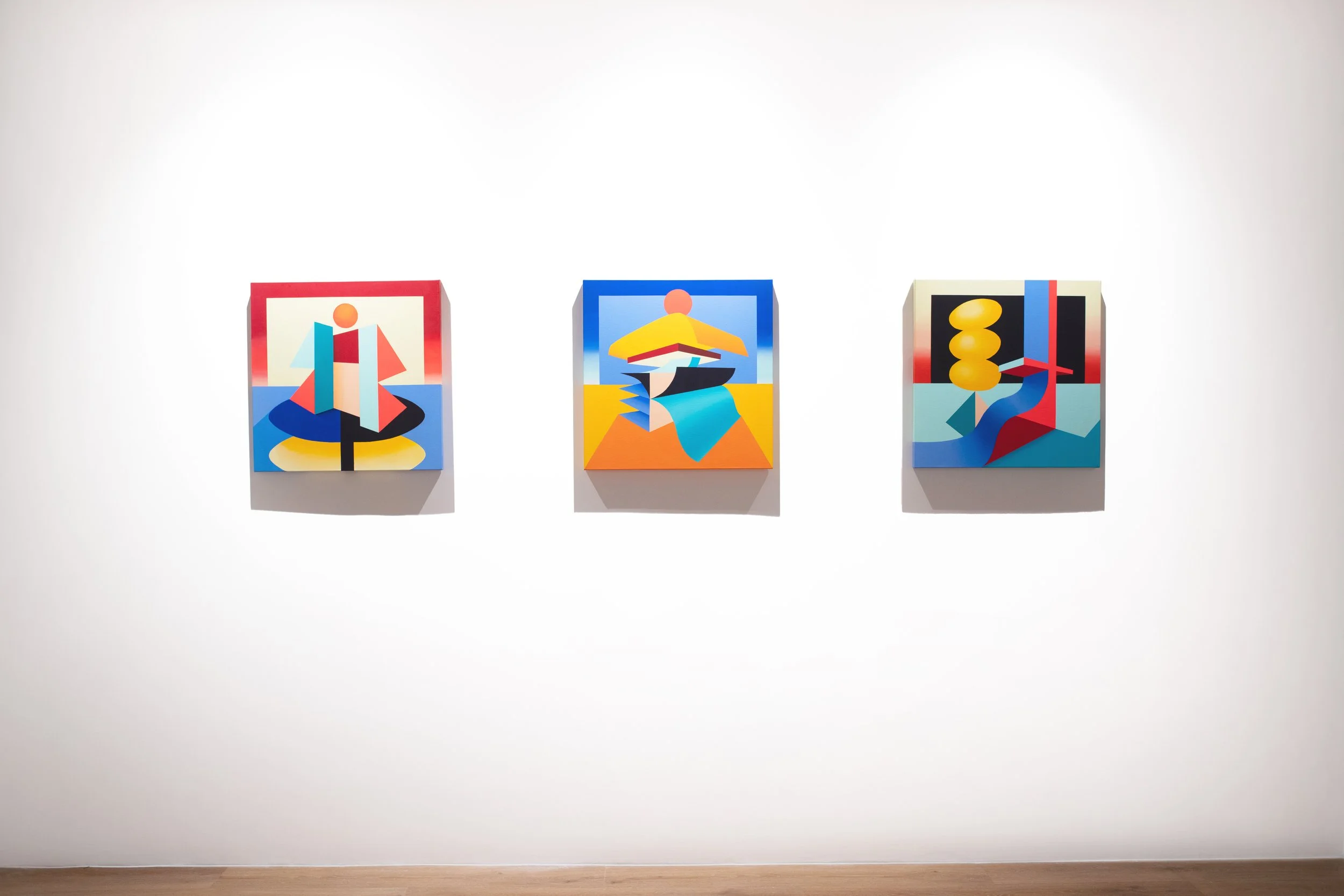 Building on her previous geometric works, where she constructed Chinese characters from simple block colour shapes, Cynthia introduces a two-point perspective that adds a third dimension and conveys a feeling of modern architectural structures set in three different locations at three different times of the day.
